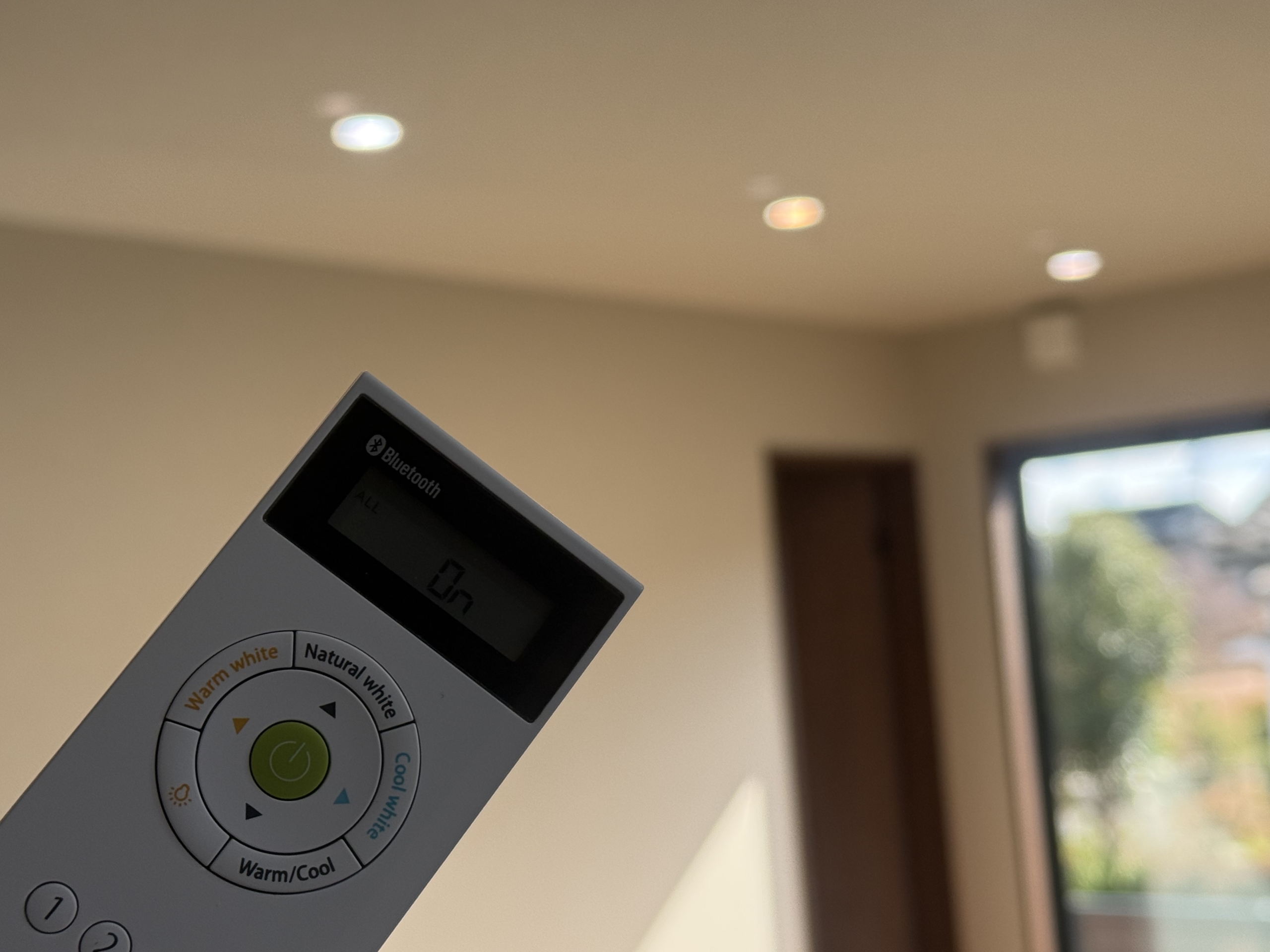 このお家のダウンライト、実はリモコンで明るさと光の色を変えられるようになっています。